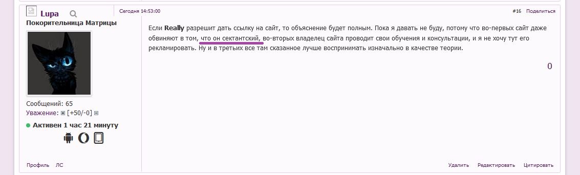 Из личного сообщения был вырезан вопрос на разрешение размещение ссылки на сайт, который мог бы помочь разобраться в её возможной связи с сектой, и вставлен в сообщение в общей теме, якобы я секты рекламирую. Кто не в курсе и не читал всей истории сначала - Лупа, это мой клон, который был создан для разоблачения Really после отлучения меня от профиля.